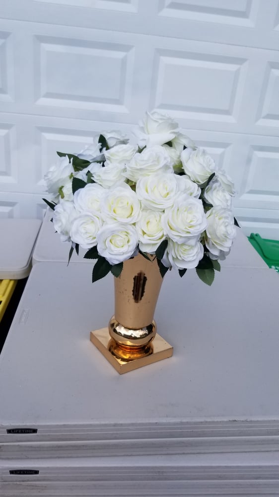 35 cm artificial white roses flower centerpiece Comes with gold vase 10 cm wide Or gold metal trumpet vase