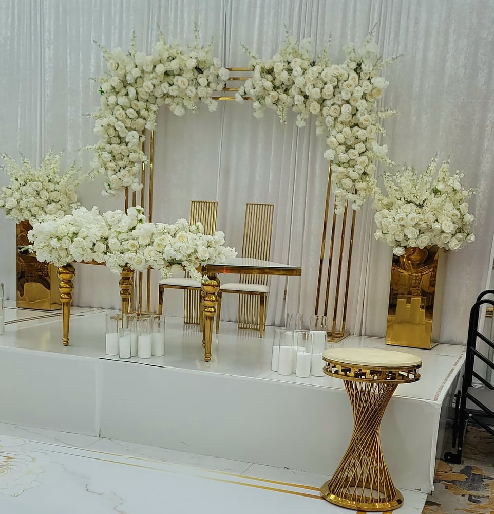 Gold Square Arch with white flowers or Greenery artificial flowers . Stage as seen