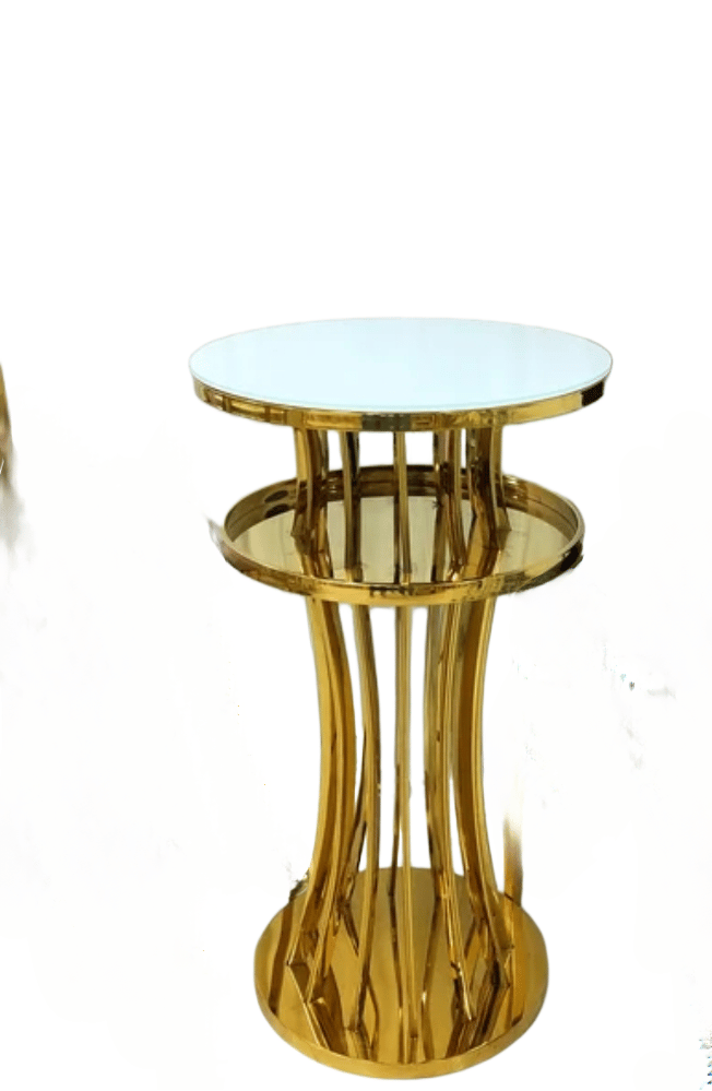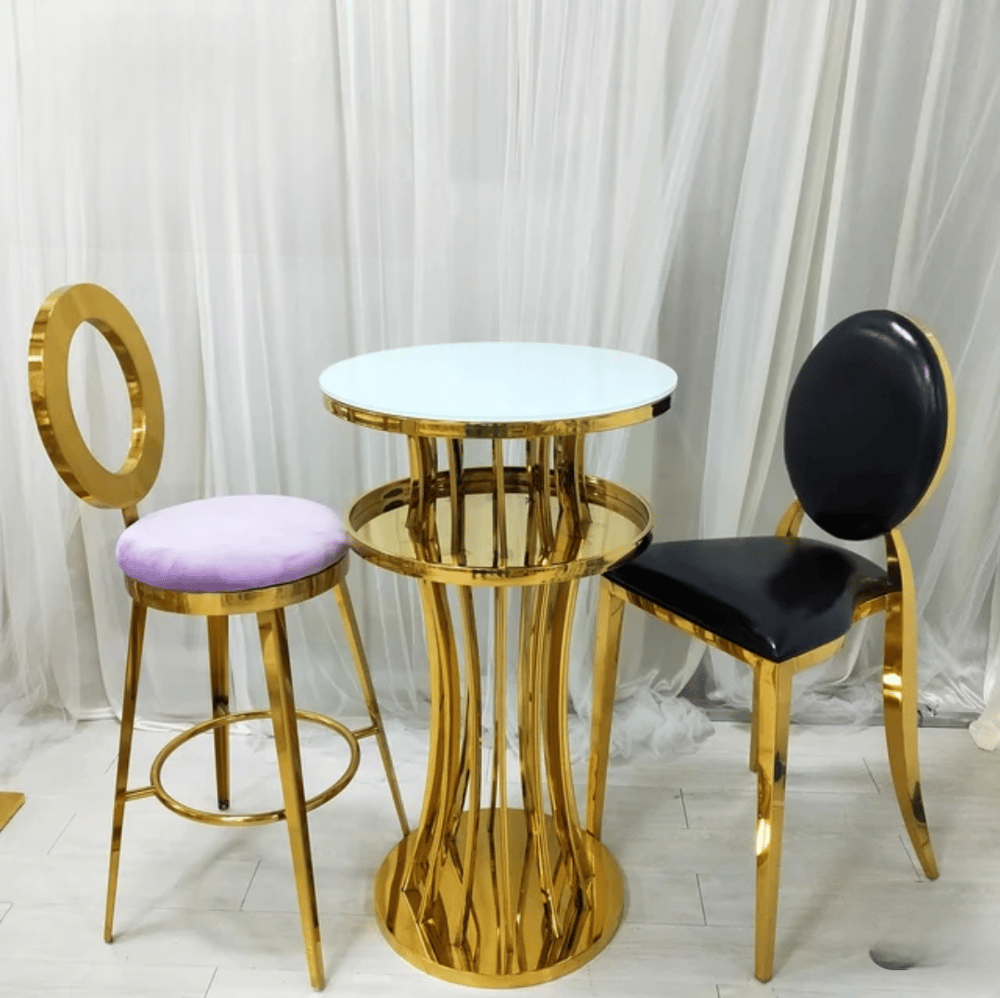 Gold stainless steel cocktail table or bar table White glass top Can be use for tall adults cake table