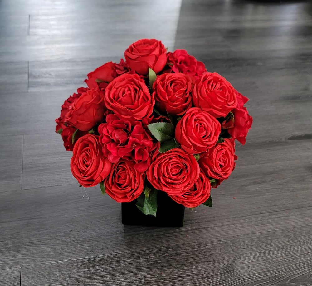 Red flower low small flower centerpiece in 5inch x 5 inch vase 5inch x 5 inch vase can be black , gold, or white vase