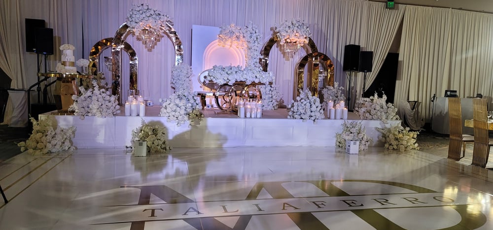 Stage design Silk Flowers Candles Backdrop Table and chair Cake stand