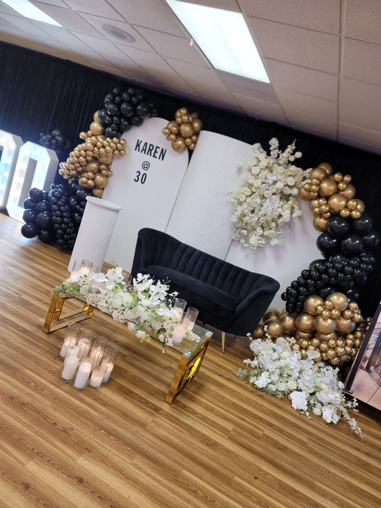 Stage design Wood curve panel White wood panel Balloons Love seat Table Candles Cake stand Black drapping Light number