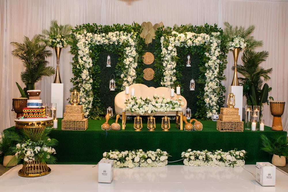 Green and white stage Love seat of your choice Traditional items of your choice basket, calabash, lamps , Green white arches Green wall Flower rolls Cake stand